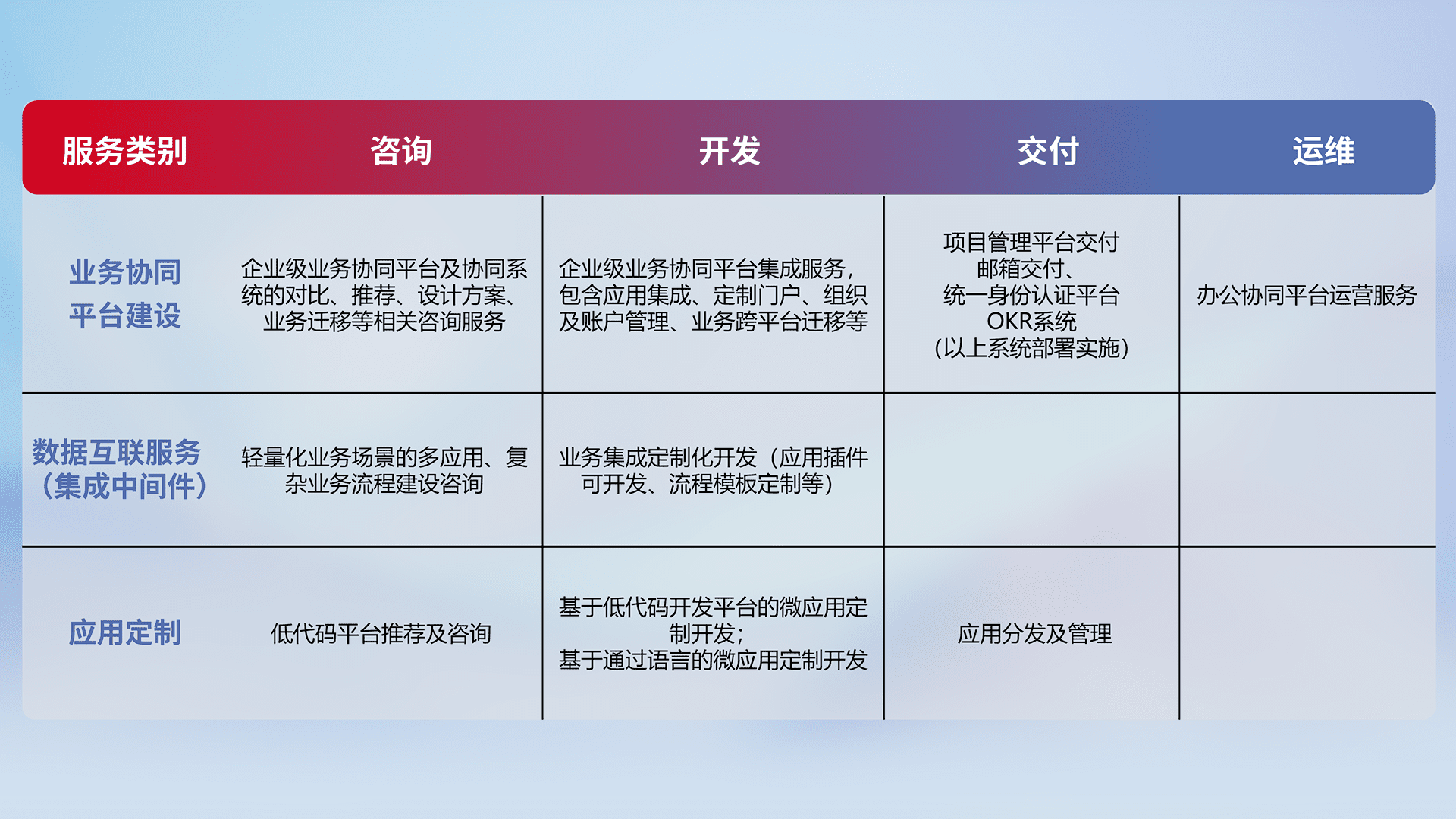 针对钉钉、、、企微、、IDaas等平台级产品提供产品的规划、、、方案、、交付、、、定制化开发等服务,,实现如统一协同办公、、、、智能客户服务、、、混合会议管理、、、、智能数据查询、、等业务场景,,,,实现数字化转型。。。