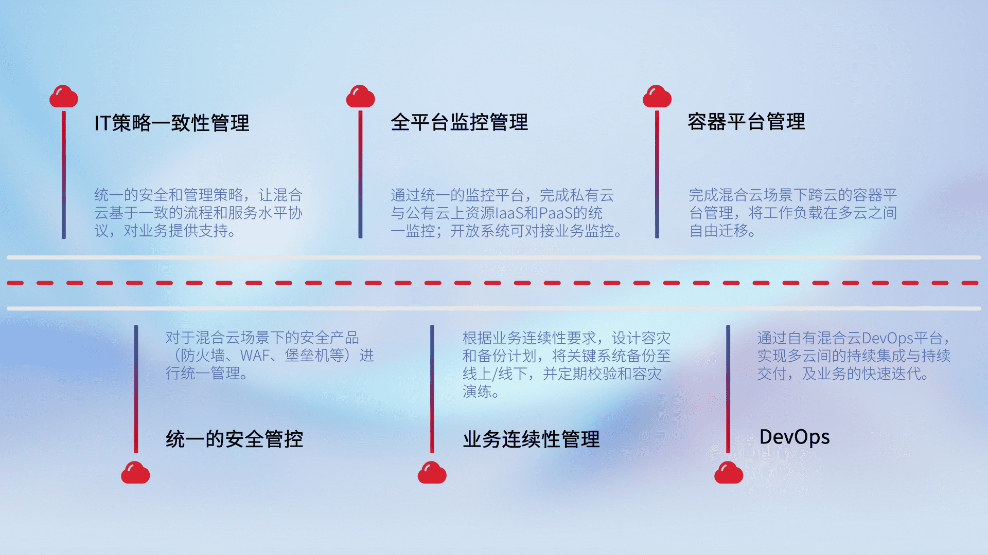 通过多云纳管,,,以统一的资源数据模型把客户的云资源进行抽象和封装,,,,进而实现对多云资源的统一操作,,,,保障云资源管理的可靠性、、稳定性与可用性。。。。量身定制化运维内容,,,配置、、开发运维、、、、补丁管理、、备份、、、监控、、、认证和访问管理、、审计和日常巡检等,,,保障在用云过程中的可靠度,,稳定度以及高可用率。。。。